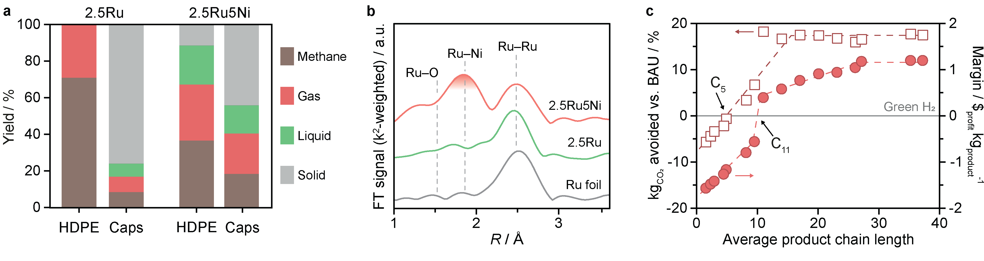 Our first study[3] identified ruthenium nanoparticles supported on titania as highly active catalysts under optimized reaction conditions, although low-value gaseous products were predominantly formed. The product distribution could be controlled by incorporating nickel as a modifier to the ruthenium phase, with the supported Ru-Ni catalysts producing up to 25% liquid (C6–C45) products from high density polyethylene and plastic caps (Fig. 1a). The optimal composition, namely 2.5 Ru wt% and 5 Ni wt% (2.5Ru5Ni), exhibited an alloyed nature, as indicated by high resolution transmission electron microscopy and extended X-ray absorption fine structure analysis (Fig. 1b). Mechanistic studies with surrogate compounds and density functional theory simulations revealed facilitated internal C–C bond cleavage over the Ru-Ni catalyst and terminal C–C bond scission over the Ru catalyst, rationalizing the observed differences in selectivity. At a systems level, techno-economic and life cycle analyses predicted economically viable processing of plastic caps –even when using green H2– with reduced CO2 emissions compared to the alternative fossil route, presenting the first example of its kind. To generalize this, we estimate a minimum average chain length of C11 in the product distribution as an effective answer to the ‘Plastic-to-X’ endeavor (Fig. 1c). This work highlights a practical route for valorizing polyethylene waste while emphasizing the importance of bridging analyses across scales to uncover design guidelines for future catalyst developments.